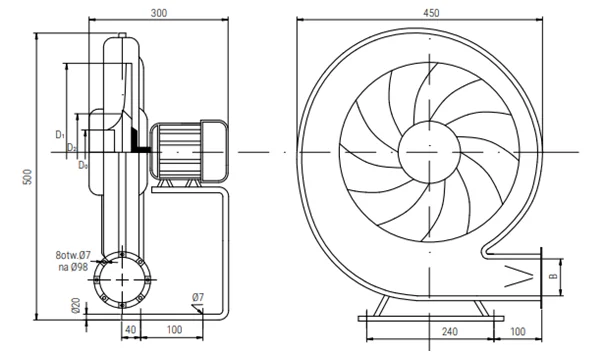Wentylatory promieniowe przeznaczone są do transportu powietrza, wiórków, granulatów, styropianu, itp., w instalacjach o stosunkowo dużych oporach przepływu. Zastosowane silniki mogą pracować w temperaturze otoczenia od -15°C do +40°C i wilgotności względnej do 95%.