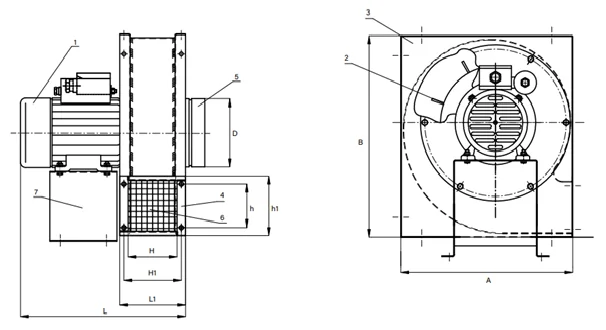 1) Silnik, 2) Wirnik, 3) Obudowa, 4) Kołnierz przyłączeniowy, 5) Króciec ssący, 6) Siatka wylotowa