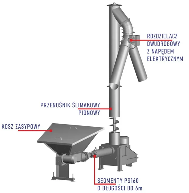 Kosz zasypowy może być przymocowany bezpośrednio do przenośnika lub odsunięty za pomocą segmentów przenośnika ślimakowego PS160 o długości 1m, 1,5m, 2m, 2,5m lub 3m (w sumie maksymalnie 6m).