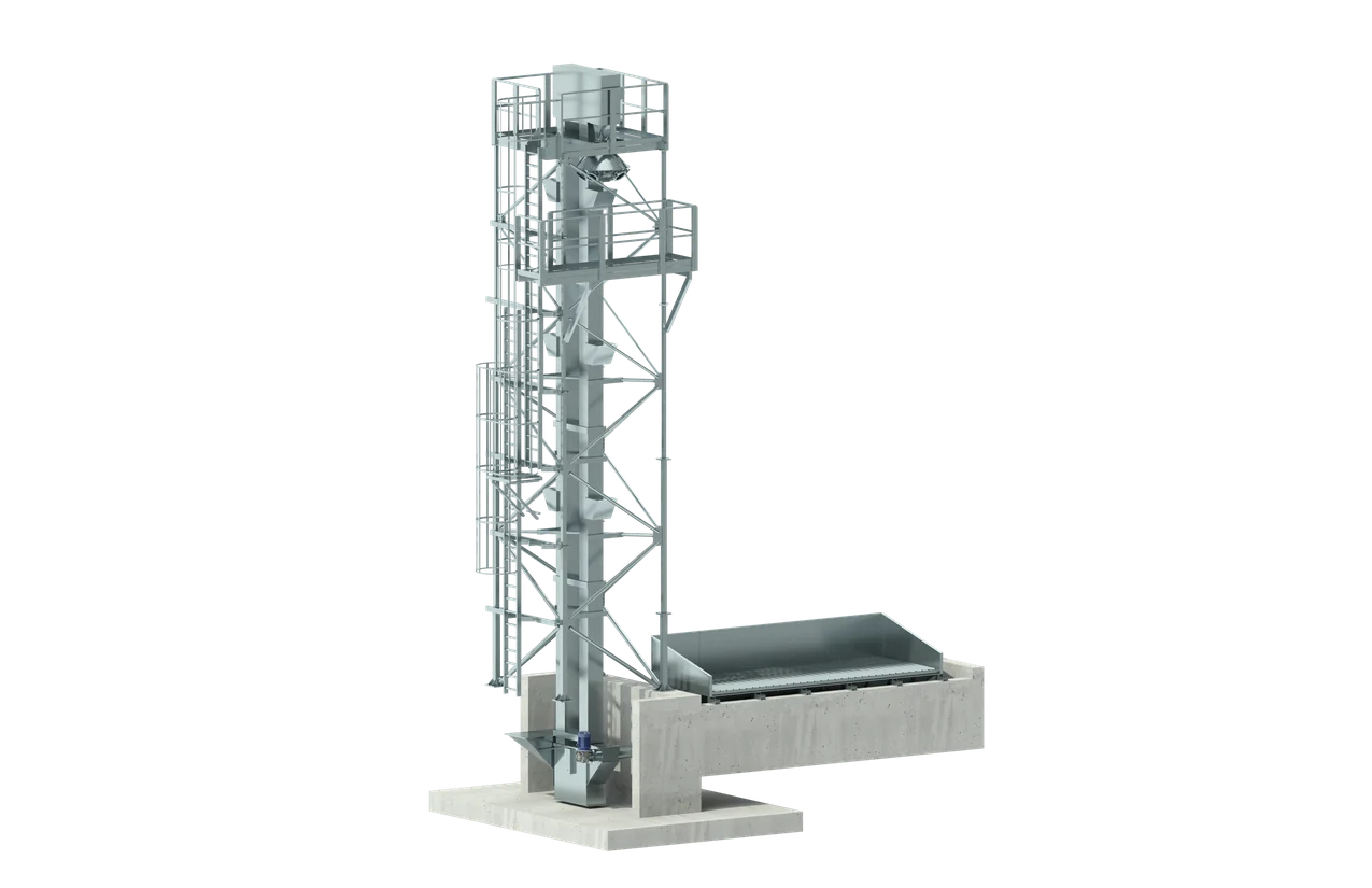 - Przenośnik kubełkowy musi być przymocowany do elementów konstrukcyjnych zapewniających jego stateczność. Do wysokich przenośników proponujemy wieże WPK z dwiema platformami do obsługi, do niższych podporę PRS z platformą eksploatacyjną. Po zastosowaniu specjalnych wzmocnień możemy przymocować przenośnik do silosu.